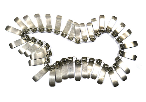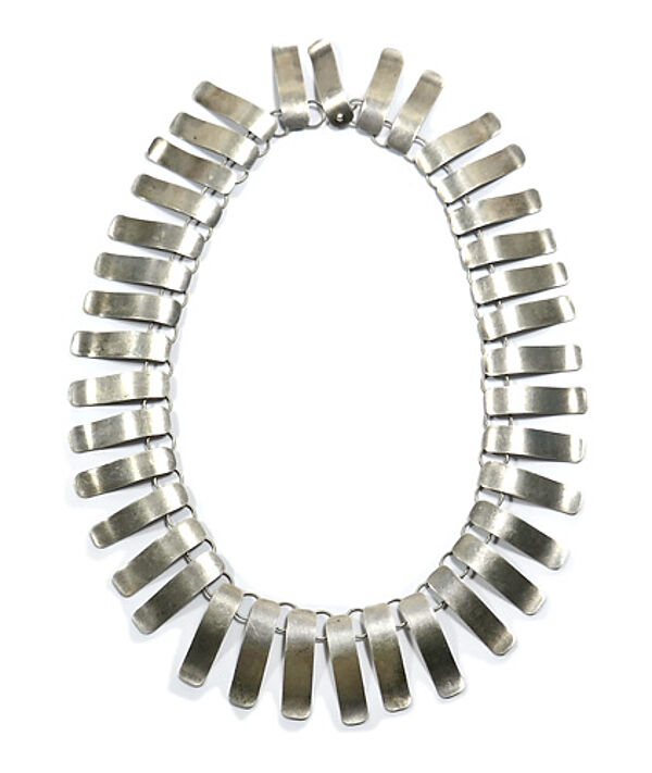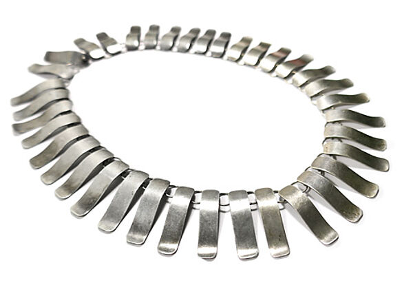 Klares, silbernes Collier (835er) - eine zarte, einfache Kette mit ringförmigen Gliedern wird durch eine Reihe im rechten Winkel aufgelegter, flach S-förmiger Bandelemente überdeckt, Hakenverschluss. Länge eines gebogenen Gliedes ca. 3 cm, Collierlänge ca. 38,5 cm, ungeputzter Zustand mit diskreter Patina und leichten Tragespuren. Unterseitig gemarkt, wohl 1920er, 30er Jahre.