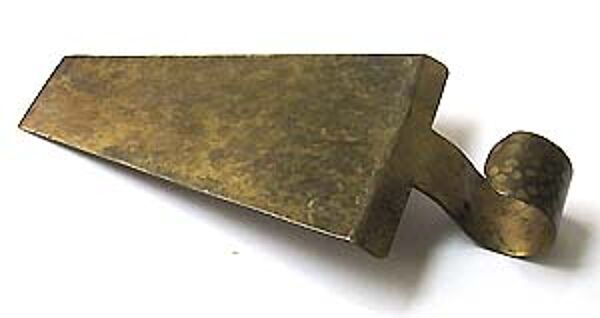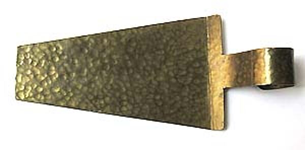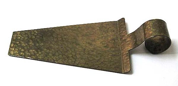 Korpus aus getriebenem Messing mit akzentuiertem Hammerschlag in geometrischer, kraftvoll-kantiger Grundform. Länge ca. 16 cm, moderate Patina mit geringen Gebrauchsspuren. Wohl Deutschland der 20er Jahre.
