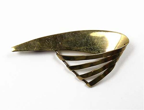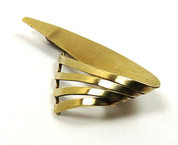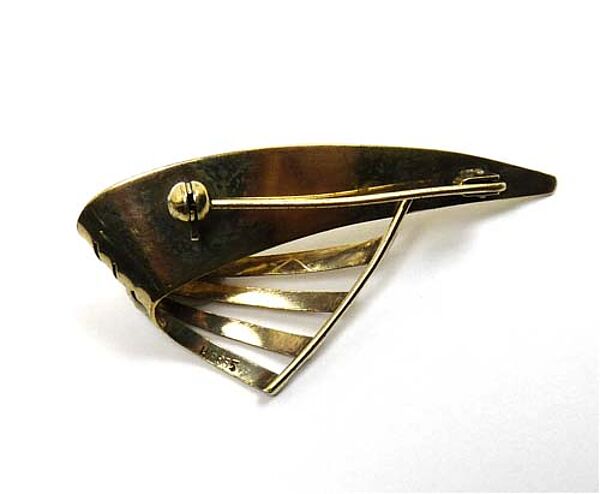 Schweifartiger, z.T. gebogener, vergoldeter Silberkorpus (835er) mit einfachem Streifendekor durch schmale Schlitzungen. Breite ca. 5,2 cm, leichte Gebrauchs- und alte Putzspuren. Rückseitig Sicherheitsbroschierung mit Kugelkopf sowie Monogramm "HP", wohl 20er, 30er Jahre.