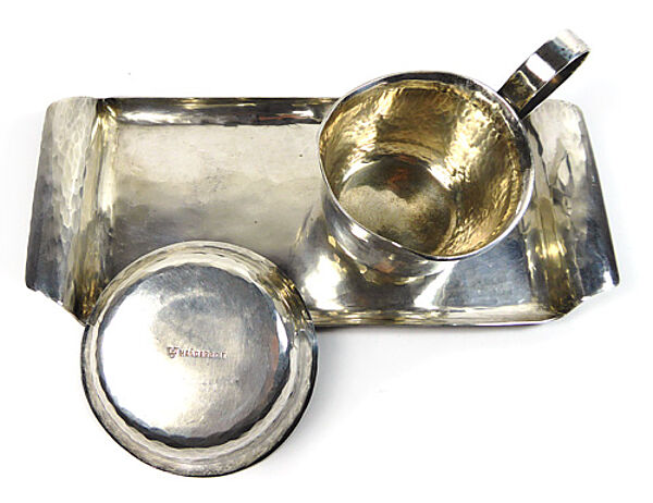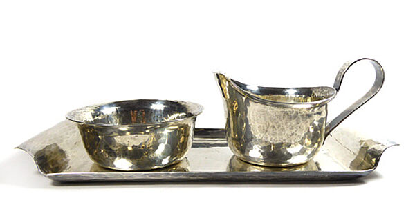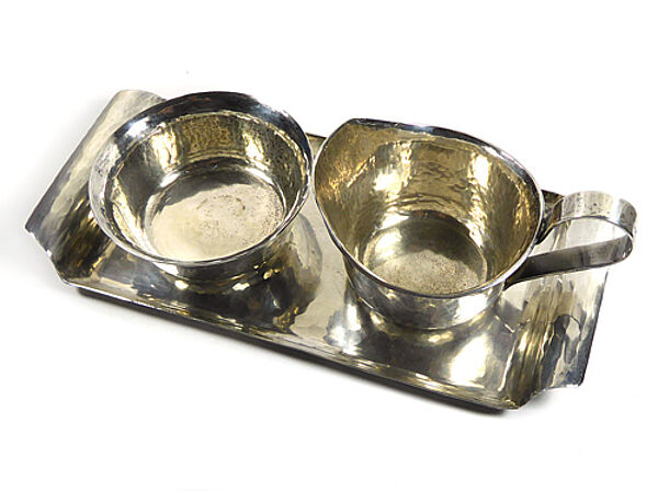 Handgetriebene Korpi aus versilbertem Neusilber. Martellierte Oberfläche. Tablettmaße ca. 24 x 11 cm, Höhe ca. 2,2 cm, Zuckerschälchen Höhe ca. 3,5 cm, Sahnekännchen Höhe ca. 7,2 cm, ungeputzter Zustand mit leichter Patina und geringen Altersspuren. Unterseitig jeweils gemarkt und bezeichnet mit "Handarbeit". Wohl 1930er Jahre.