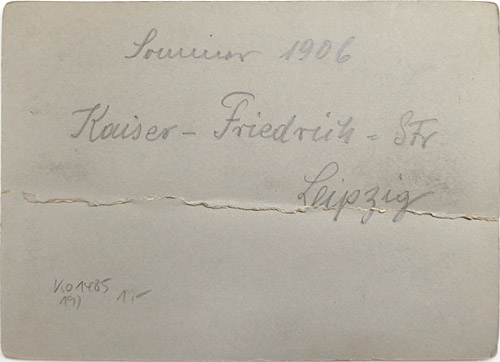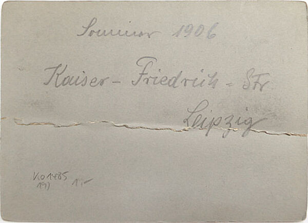Albuminabzug auf Karton kaschiert, rückseitig handschriftlich bezeichnet: "Sommer 1906 . Kaiser-Friedrich-Str. Leipzig". Bildmaße ca. 16,5 x 11,5 cm, Pappunterlage ca. 17,7 x 12,7 cm, deutlicher querverlaufender Knick.