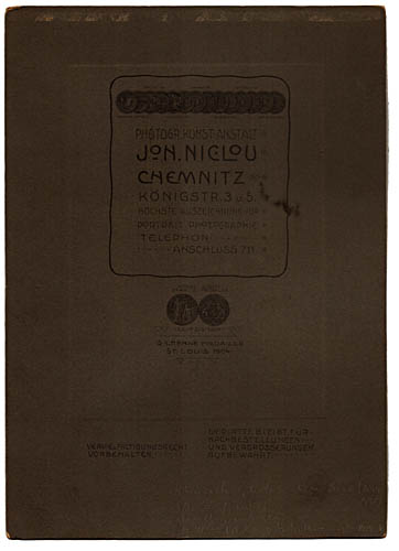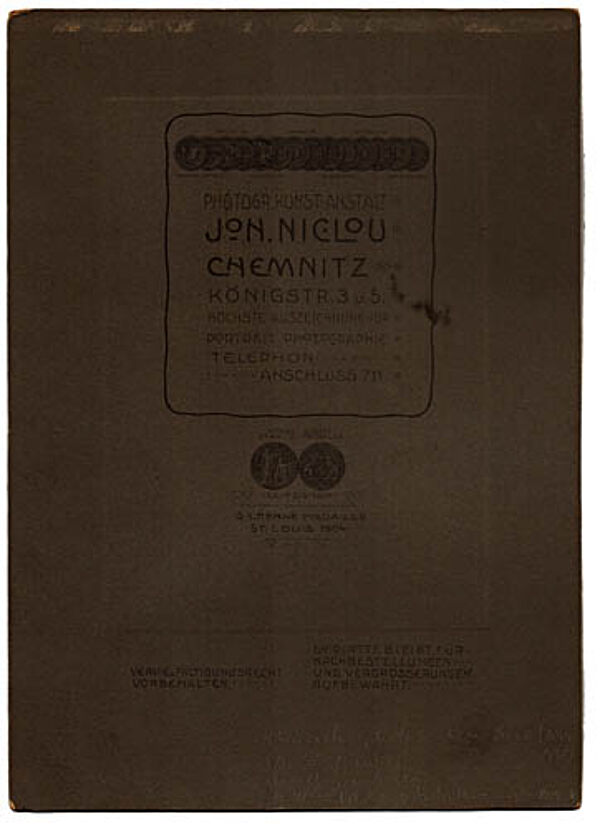 Albuminabzug in Brauntönen mit den Maßen von ca. 14,5 x 9,8 cm, aufgezogen auf bräunliche Pappe mit den Maßen von ca. 22,7 x 16,4 cm. Unter der Darstellung handschriftliche Widmung: "Zur freundlichen Erinnerung ....". Die Pappe ist minimal uneben und insbesondere rückseitig etwas fleckig, hier auch oberseitig Reste einer alten Montierung. Rückseitig Firmen-Logo von Johann Niclou, erwähnt im Lexikon der Fotografen (http://www.fotorevers.eu/de/fotograf).