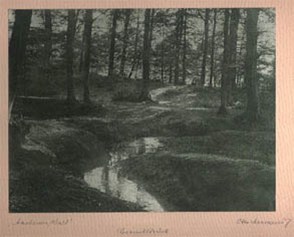 Vintage (Bromöldruck) mit den Maßen ca. 22 cm x 16,5 cm, auf Karton aufgezogen, ca. 32 x 24 cm, rückseitig bezeichnet und datiert "Aachener Wald" Aug. 1913, rückseitig handschriftliche Dokumentation (wie z.B. Motiv, Tag und Stunde der Aufnahme, Objektiv, Blende, Platte, Druckverfahren, Apparat).