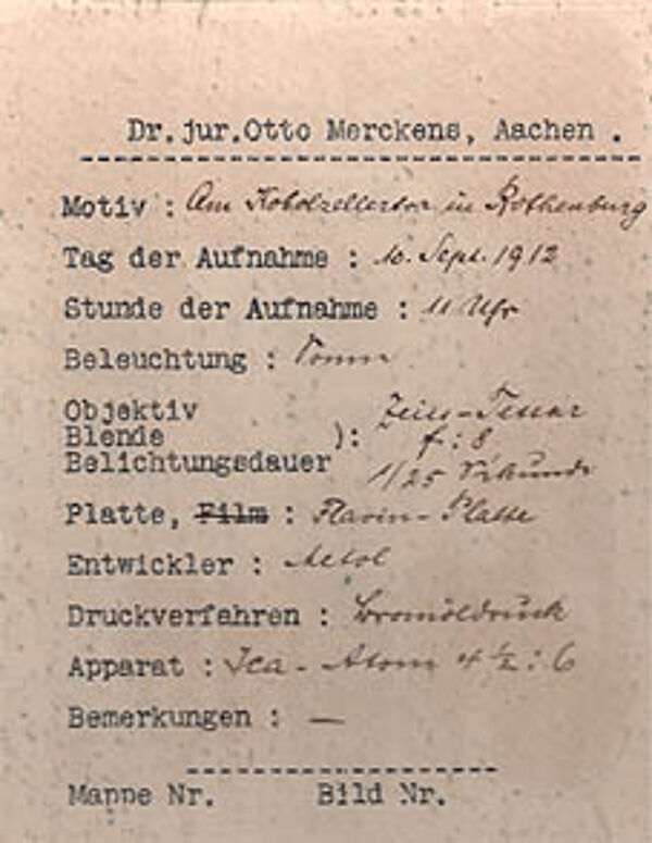 Vintage (Bromöldruck) mit den Maßen ca. 21,7 x 15,5 cm, auf Karton aufgezogen, ca. 32 x 24 cm, rückseitig bezeichnet und datiert : "Am Kobolzellertor in Rothenburg", Sept 1912, rückseitig handschriftliche Dokumentation (wie z.B. Motiv, Tag und Stunde der Aufnahme, Objektiv, Blende, Platte, Druckverfahren, Apparat).
