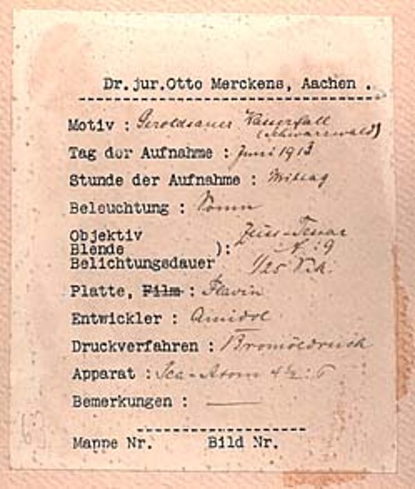 Vintage (Bromöldruck) mit den Maßen: ca. 15,7 x 22 cm, auf strukturiertem Karton aufgezogen (ca. 24 x 32,3 cm), rückseitig bezeichnet und datiert: "Geroldsauer Wasserfall (Schwarzwald)" Juni 1913 - siehe Detailfoto, rückseitig handschriftliche Dokumentation (wie z.B. Motiv, Tag und Stunde der Aufnahme, Objektiv, Blende, Platte, Druckverfahren, Apparat).