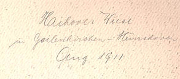 Vintage (Bromöldruck) mit den Maßen ca. 22 x 15 cm, auf Karton aufgezogen, ca. 32 x 24 cm, rückseitig bezeichnet und datiert "Haihover Wiese in Geilenkirchen Heinzhoven", Aug. 1911, rückseitig handschriftliche Dokumentation (wie z.B. Motiv, Tag und Stunde der Aufnahme, Objektiv, Blende, Platte, Druckverfahren, Apparat).