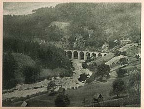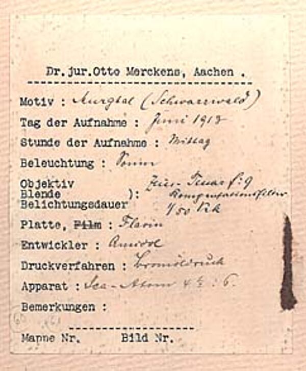 Vintage (Bromöldruck) mit den Maßen ca. 21,4 x 15,8 cm, aufgezogen auf Karton, (ca. 24 x 32,3 cm), kleinere Verschmutzung, vermutlich Klebereste, rückseitig bezeichnet und datiert: "Murgtal (Schwarzwald)", Juni 1913, rückseitig handschriftliche Dokumentation (wie z.B. Motiv, Tag und Stunde der Aufnahme, Objektiv, Blende, Platte, Druckverfahren, Apparat).