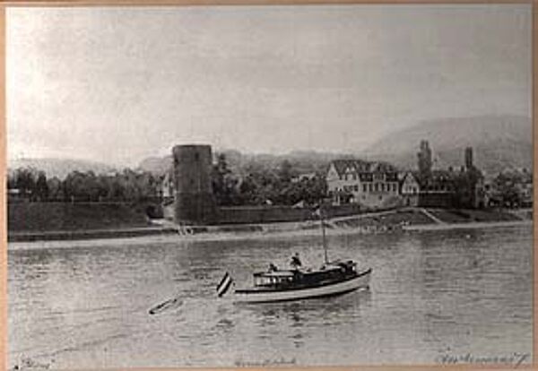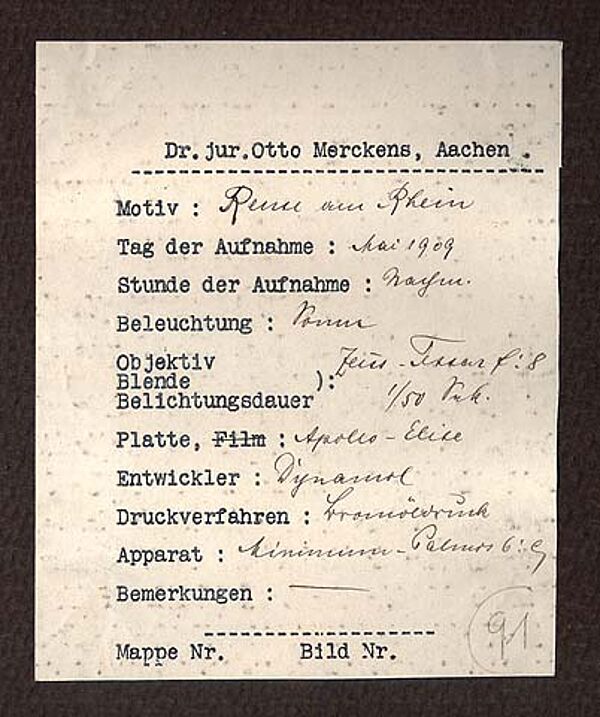 Vintage (Bromöldruck) mit den Maßen ca. 22 x 15 cm, auf dunklem Karton aufgezogen, ca. 34 x 25 cm, vorderseitig auf dem Druck unterzeilig bezeichnet: "Rhens, Bromöldruck, Otto Merckens", rückseitig bezeichnet und datiert "Rhens (? oder eher) Reuse am Rhein" Mai 1909, rückseitig handschriftliche Dokumentation (wie z.B. Motiv, Tag und Stunde der Aufnahme, Objektiv, Blende, Platte, Druckverfahren, Apparat).