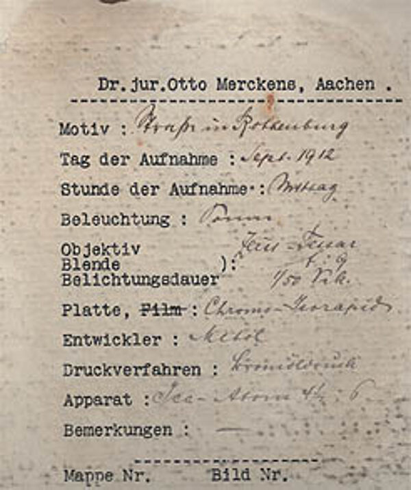 20 cm x 12,5 cm, montiert auf festem Papier, rückseitig handschriftliche Dokumentation (wie z.B. Motiv, Tag und Stunde der Aufnahme, Objektiv, Blende, Platte, Druckverfahren, Apparat).