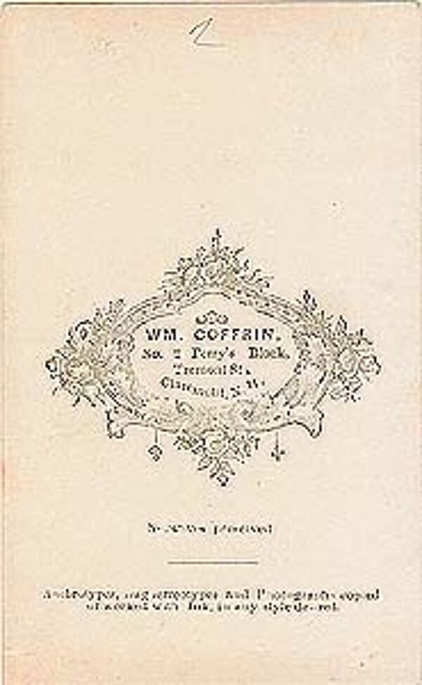 Albuminabzug (Maße: ca. 9,0 x 5,5 cm), aufgezogen auf dünnem Karton (Maße: ca. 10,3 x 6,2 cm). Auf der Rückseite bezeichnet "WM.COFFRIN, No.2 Perrys Block, Tremont St, Claremont N.H." sowie weitere, z.T. schlecht lesbare Erläuterungen. Insgesamt moderate Griff- und Altersspuren, rechts oben kleiner Strich auf dem Abzug. Wohl um 1860 /70.