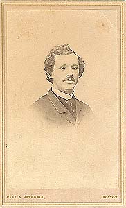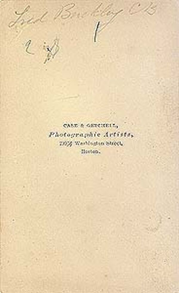 Albuminabzug (Maße ca. 8,6 x 5,3 cm), aufgezogen auf dünnem Karton mit Goldrahmen (Maße ca. 10,0 x 6,2 cm). Unter dem Foto, bezeichnet "CASE & GETCHELL Boston" sowie auf der Rückseite "CASE & GETCHELL, Photographic Artists, 299 1/2 Washington Street, Boston" sowie handschriftlicher Vermerk (Bleistift): "Fred Bucklay C/B" (schlecht lesbar). Rechts oben Eckknick, insgesamt leichte Griff- und Altersspuren. Wohl um 1870.