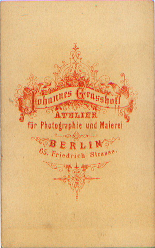 CDV (carte de visite) - Brauntoniger Albuminabzug, kaschiert auf chamois-tonigem Karton mit den Maßen von ca. 10,1 x 6,2 cm, Maße des Abzugs ca. 8,9 x 5,7 cm, geringe Alters- und Griffspuren. Unterhalb des Fotos und Rückseitig Firmenbezeichnung des Fotografen. Wohl um 1880 - 90.