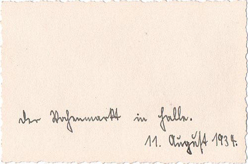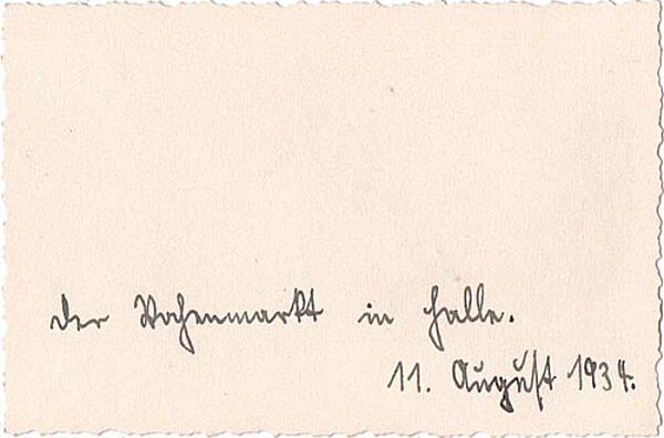 Fotografie mit den Maßen ca. 9,2 x 6,2 cm, wellenförmiger zierrand. Rückseitig handschriftlich bezeichnet: "der Wochenmarkt in Halle. 11. August 1934". Minimale Altersspuren.