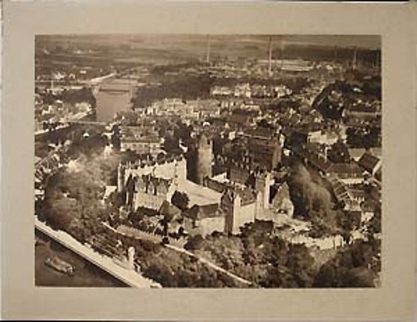 Brauntonige Fotografie, montiert auf strukturiertem Pappeträger (dieser mit Griffspuren und leicht fleckig, Kanten etwas bestossen, rückseitig Reste alter Rahmung, das Foto selbst ist tadellos). Bildmaße ca. 28 x 39 cm, Gesamtgröße ca. 35,5 x 46,5 cm, rechts unten bezeichnet "Junker Luftbild", rechts oben einbelichtete Nummer "18467", wohl Ende der 20er, Anfang der 30er Jahre.
