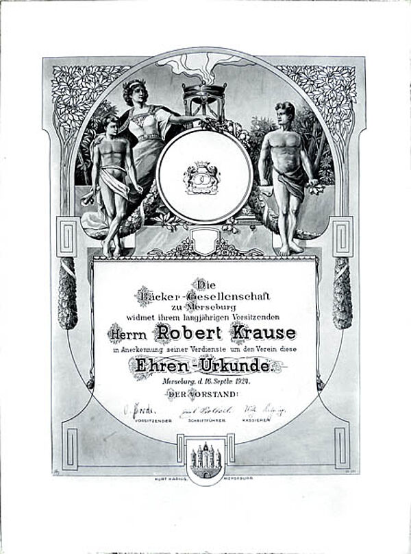 Beigegeben ist eine Ehrenurkunde der Bäcker-Gesellschaft von 1929. Sie wurde auf den langjährigen Ehenvorsitzenden Robert Krause ausgestellt und handschriftlich von den drei Vorstandsmitgliedern unterschrieben. Sie hat die Maße ca. 47,5 x 35 cm und weist geringe Alters- bzw. Griffspuren auf.