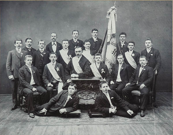 Albuminabzug auf Pappe aufgezogen. Am oberen Rand betitelt, unter dem Foto die Namen der einzelnen Mitglieder. Maße der Fotografie ca. 28 x 22 cm, Maße der Pappe ca. 38 x 33,5 cm, diese hat oberhalb des Fotos eine waagerecht verlaufende Knickspur, mehrere, überwiegend kleinere Stockflecken und rechts unten einen größeren Wasserfleck, der Albuminabzug weist nur geringe Altersspuren auf.