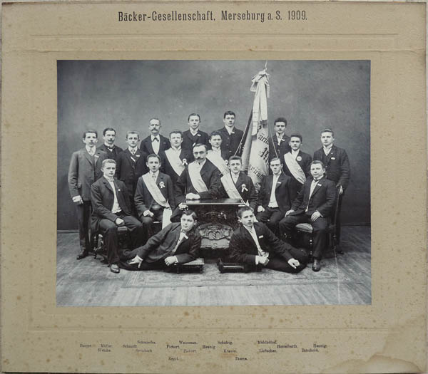 Großformatiger Albuminabzug: "Bäcker-Gesellschaft, Merseburg a.S. 1909", beigegeben Ehrenurkunde.