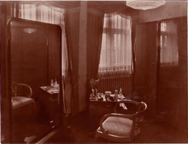 Vintage (braun getönter Abzug auf glänzendem Papier) mit den Massen 22,3 x 17,2 cm, wohl um 1920. Abgebildet ist ein Interieur einer Fabrikanten-Villa in der Leipziger Str. in Schkeuditz (die Familie war Besitzer des bekannten Geschäftes "Brühl-Pelz" in Leipzig). Minimalste Eckstauchungen, rückseitig Montierungsspuren.