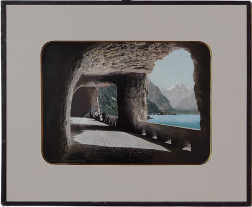 Kolorierter Albuminabzug, wohl auf Karton kaschiert, hinter zwei am Rand verklebten Glasscheiben gerahmt (ungeöffnet), links unten einbelichtete Bezeichnung: "AXENSTRASSE". Maße des Fotos im Passepartoutausschnitt ca. 22 x 16 cm, Außenmaße der originalen Rahmung ca. 33 x 27 cm, geringe Alters-, Griff- und Lagerspuren. Wohl um 1900 bis 1915.