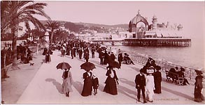 Brauntonige Vintage-Panoramafotografie auf Postkartenkarton. M.: ca. 28 x 14,5 cm. Vorderseitig bezeichnet: "Nice - Jetee-Promenade" sowie rückseitig "Etablissement de Photographie GILETTA freres Nice", Frankreich um 1900.