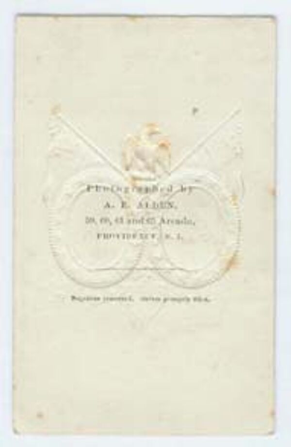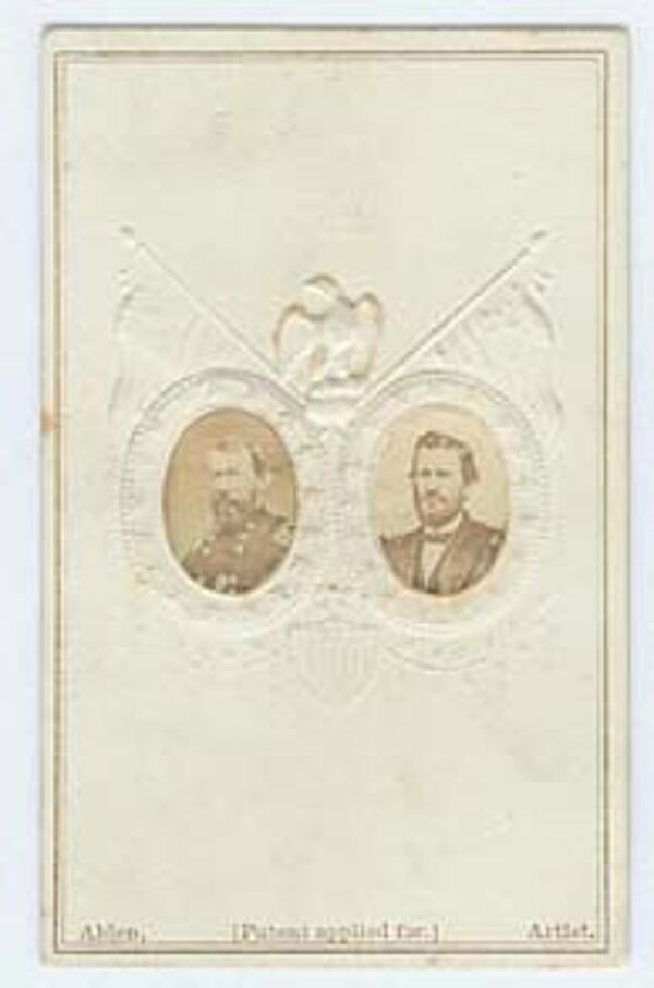 Maße ca. 10 x 6,2 cm, dargestellt sind wohl General Francis Preston Blair jr. (1821 - 75) und General Ulysses S. Grant (1822 - 85) jeweils im ovalen Bildausschnitt, umgeben von geprägten Fahnen und Adler, aufgenommen vermutlich zwischen ca. 1860 und 69. Für das Alter eher geringe Gebrauchsspuren, es zeigen sich leichtere Verschmutzungen und z.T. minimale Bräunungen, siehe Abbildung.