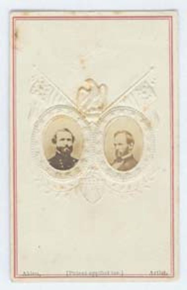 Maße ca. 10 x 6,2 cm, dargestellt sind General George H. Thomas (1816-70) und General William Tecumseh Sherman (1820-91) jeweils im ovalen Bildausschnitt, umgeben von geprägten Fahnen und Adler, aufgenommen vermutlich zwischen ca. 1860 und 69. Für das Alter eher geringe Gebrauchsspuren, es zeigen sich leichtere Verschmutzungen und z.T. minimale Bräunungen, siehe Abbildung.