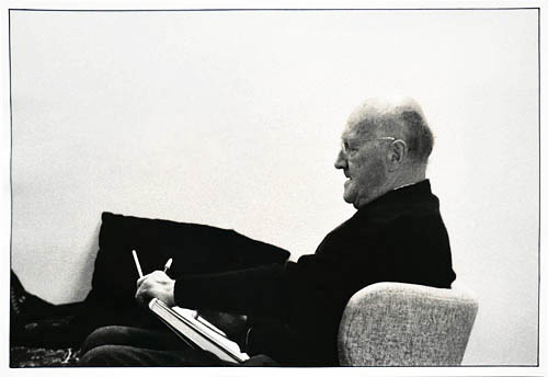 Porträt von Charles Crodel, im Sessel sitzend und lesend. Re-Vintage Handabzug vom wiederentdeckten Original-Negativ auf Barrytpapier mit der Autorisierung (siehe rückseitige Signatur) des Fotografen und Crodel-Schülers Carl Helmut Steckner. Die Aufnahme entstand zu einem Geburtstag des Künstlers in den 1970er Jahren.