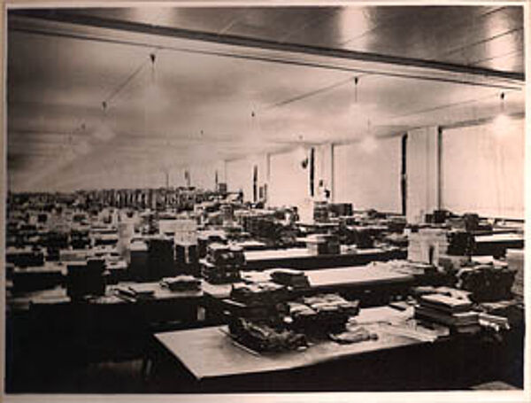 Vintage, vermutlich als Dokumentation bzw. Präsentation vom Werk Textilfabrik Robert Götze (ROGO-Werke in Oberlungwitz bei Chemnitz) herausgegeben, ca. 17,5 x 23,5 cm, montiert auf Karton, hier bezeichnet: "Neue praktische Beleuchtung schont das Auge an Wintertagen". Rückseitig Stempel: "Photo- Werkstätten J.R.Kriticka, Chemnitz, Grünband 2, Ruf: 54513". Zudem Fotografen-Name rechts unten ins Papier geprägt. Typische Arbeit des "Neuen Sehens", Deutschland der 20er / 30er Jahre.