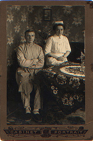 Vintage-Fotografie: Aufnahme eines Patienten (Soldaten) mit Krankenschwester von 1916