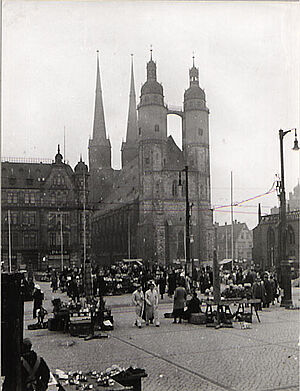 Vintage-Pressefotografie: "Marktplatz mit Liebfrauenkirche in Halle"