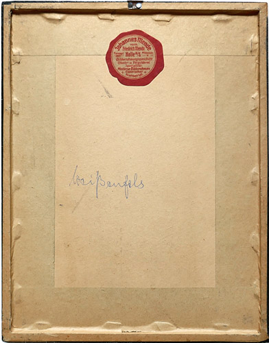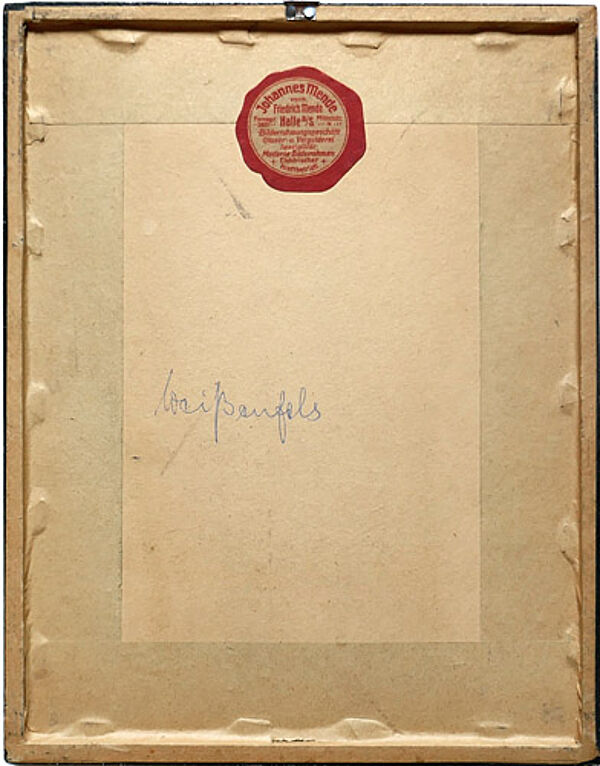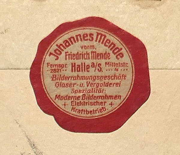 Auf chamoistonigem Karton aufgezogene Vergrößerung mit den Maßen von ca. 16,5 x 13 cm, Außenmaße der schmalen, schwarz gefassten Holzleiste aus der Zeit ca. 23 x 18 cm. Geringe Altersspuren. Rückseitig Aufkleber der Rahmenhandlung "Johannes Mende / Halle". Wohl 1920er, 30er Jahre.