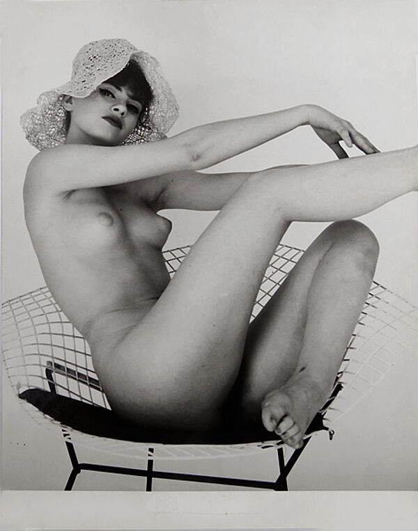 Vintage-Fotografie: sitzender weiblicher Akt auf "Diamond Chair"