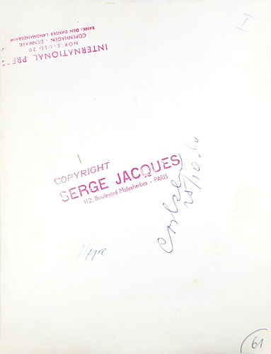 Maße der S/W-Vergrößerung ca. 24 x 18 cm, geringe bis allenfalls moderate Alters-, Griff- und Lagerspuren. Rückseitig Fotografenstempel: "Copyright Sege Jacques, 112, Boulevard Malesherbes - Paris" und Agenturstempel: "International Press, Nörrevold 20, Copenhagen - Denmark". Wohl 1960er Jahre.
