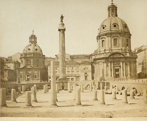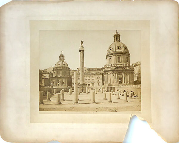 Leicht brauntoniger Albuminabzug, kaschiert auf dünnem, grauen Karton. Am unteren Rand einbelichtete Bezeichnung: "Roma: Foro Trajano". Maße der Fotografie ca. 25,6 x 20 cm, Maße des Kartons ca. 45,7 x 35 cm, geringe bis allenfalls moderate Altersspuren. Insbesondere der Albuminabzug ist nur diskret verblichen, allerdings weist der Trägerkarton deutlichere Altersspuren auf, insbesondere einen größeren Ausriß des Trägerkartons am rechten unteren Rand (der Albuminabzug wird tangiert, ist aber nicht beschädigt). Rückseitig handschriftlich bezeichnet. Wohl um 1890