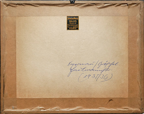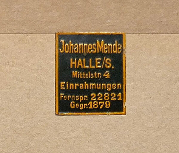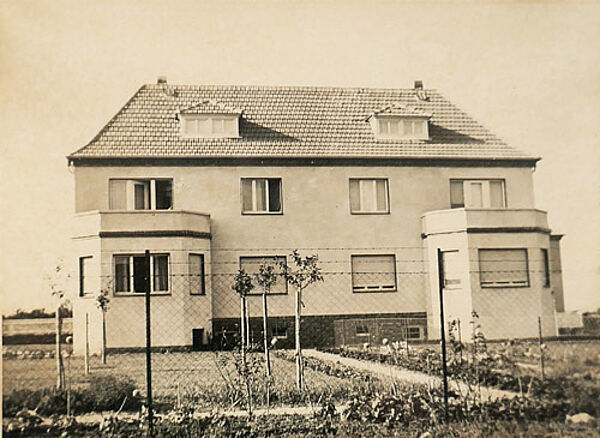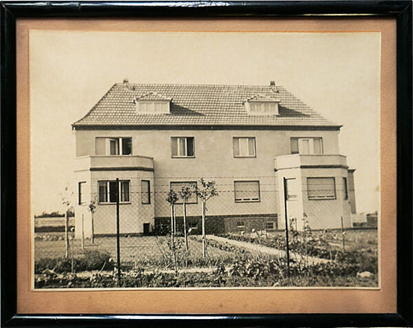 Fotografie eines Zweifamilienhauses, rückseitig Aufkleber des Rahmers: "Johannes Mende / Halle". Fotomaße ca. 23 x 17 cm, Außenmaße der schwarz gefassten Holzleiste aus der Zeit ca. 27 x 21,5 cm, geringe Altersspuren. Rückseitig ortsbezeichnet und datiert: "....Faulmannstr., (1935/36)".