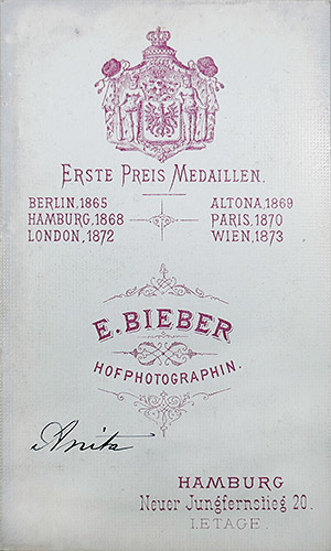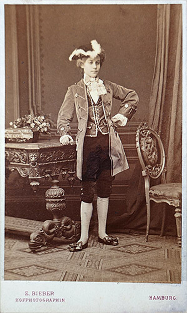 Carte de Visite (= CdV), Albuminabzug, kaschiert auf Karton mit den Maßen ca. 10,5 x 6,3 cm, am unteren Rand bezeichnet "E. Bieber" und "Hamburg", rückseitig Angaben zu Erste-Preis-Medaillen (Berlin 1865, Hamburg 1868, London 1872, Altona 1869, Paris 1870, Wien 1873) sowie Adresse "Hamburg - Neuer Jungfernstieg 20", zudem handschriftliche Bezeichnung "Anita", evtl. eine Schauspielerin. Dargestellt ist eine junge Frau in einem historischen Kostüm (Kniebundhosen, Weste, mantelartige Jacke, Dreispitz und wohl auch mit Perücke) in einem Neorenaissance-Ensemble. Geringe Alters- und Griffspuren. Die Aufnahme dürfte Ende der 1860er oder Anfang der 1870er Jahre entstanden sein.