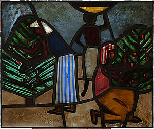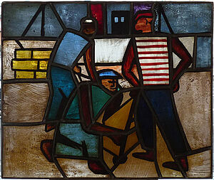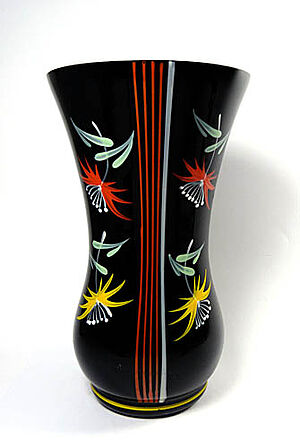 Schwarze Glasvase mit farbiger Emaillemalerei