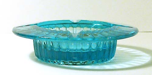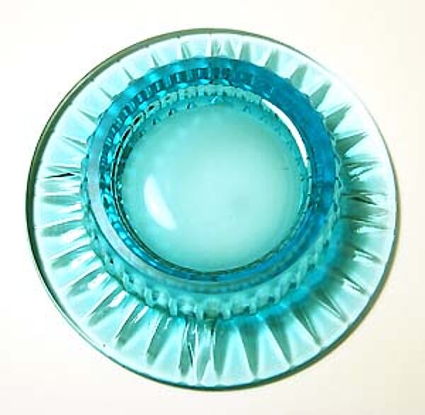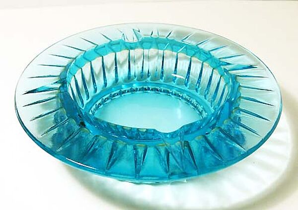 Der Korpus aus hellblauem Pressglas setzt sich aus einem unteren zylindrischen und einem scheibenartigen oberen Anteil zusammen, letzterer weist vier Vertiefungen zur Zigarettenablage auf. Reliefiertes Rillen- bzw. Zackendekor. Durchmesser ca. 16 cm, Höhe ca. 4 cm, geringe Gebrauchsspuren. Evtl. Deutschland der 30er Jahre.