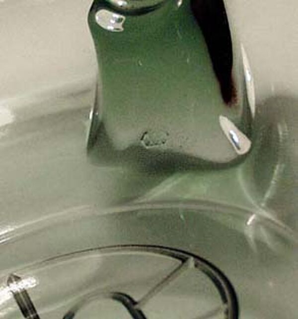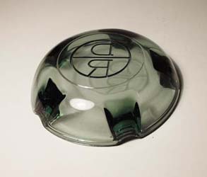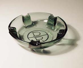 Schalenförmiger-Korpus aus bronze-grünem Pressglass mit fünf in den Rand "eingedrückten", gerillten Zigarettenablagen. Am Boden eingeschliffenes "DR", wohl Werbung für die Deutsche Reichsbahn. Der Entwurf von Wilhelm Wagenfeld für die Vereinigte Lausitzer Glaswerke AG Weißwasser (gemarkt mit Raute) stammt aus dem Jahr 1937 (WVZ 284).