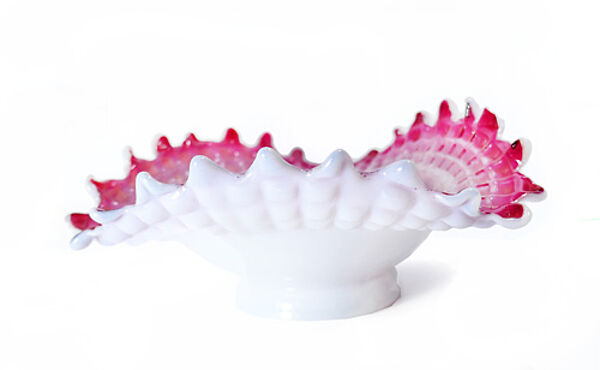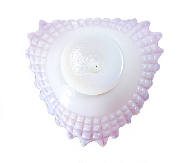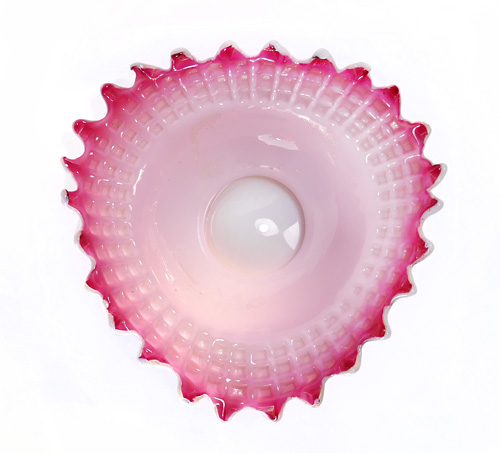 Mungeblasener Korpus aus Milchglas, oberseitig mit hellrotem Klarglas überfangen. Asymmetrischer, ausgezipfelter Rand mit waffelartig geprägtem Gittermuster. Flacher, zylindrischer Stand. Maße ca. 14 x 14 cm, Höhe ca. 6 cm, geringe Altersspuren. Unterseitig leicht verschliffener Abriss. Wohl Dänemark um 1900.