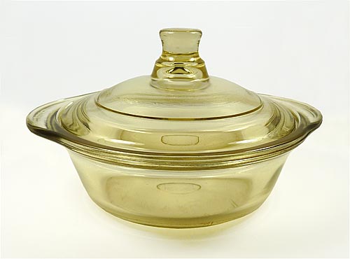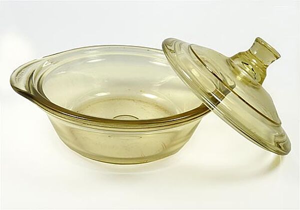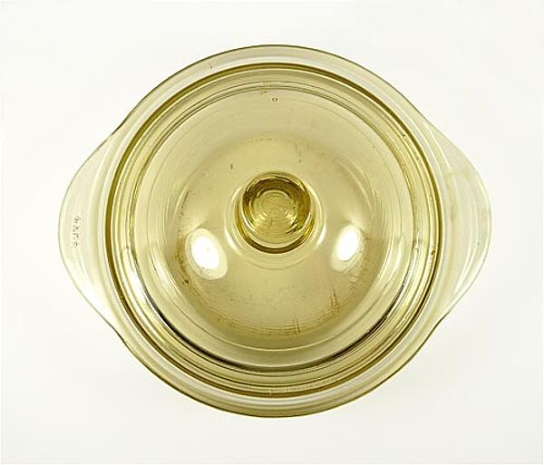 In der Grundform runder Korpus aus gelblichem, relativ dickwandigen, feuerfesten Glas. Der leicht ausgestellte Randbereich erweitert sich an den Stirnseiten jeweils zu sichelförmigen Handhaben. Zugehörig ein gewölbter, relativ hoher Deckel mit oberseitig stopfenartigem Griff. Maß von Handhabe zu Handhabe ca. 19,8 cm, Gesamthöhe ca. 11 cm, geringe Gebrauchsspuren. An Bodenunterseite Markung sowie (Modell?)Nr. 3004. Laut Werksverzeichnis handelt es sich um einen Entwurf von 1933 (Ausführung hier wohl zwischen 1933 und 35) mit der WVZ-Nr. 76. Allerdings ist in dem Buch legendären Buch "Die neue Wohnung" von Bruno Taut, welches bereits 1924 erschien, obige Backschüssel bereits abgebildet (siehe Abb. 31. "Bauhaus Weimar. Küche im Haus am Horn"), so dass der Entwurf wohl noch vor Wagenfelds offizieller Anstellung bei Schott entstanden sein dürfte.