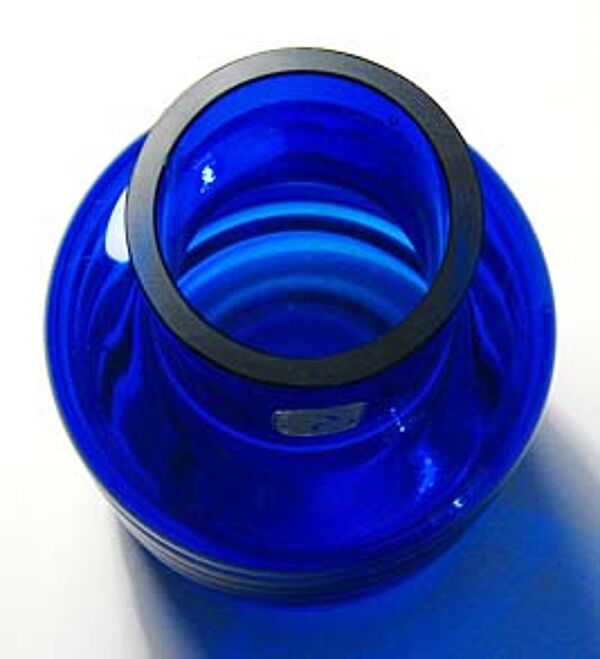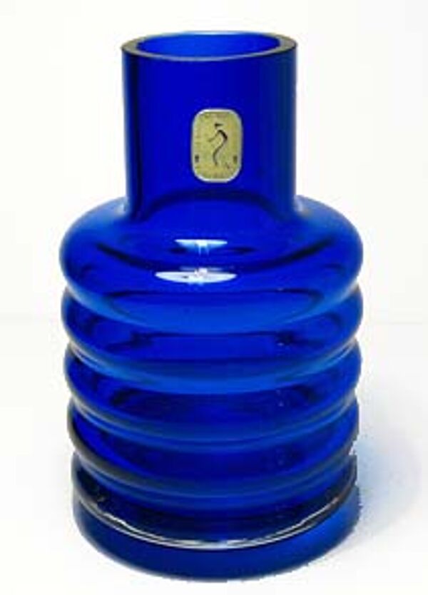 In der Grundform zylindrischer, wellenartig geformter Korpus mit schmal abgesetztem, glatten Halsbereich. Das blaue Kristallglas weist innen am Hals eine Kratzspur und eine kleine, langgezogene Blase auf. Höhe ca. 16 cm. Erhaltenes Hersteller-Etikett, wohl 1970er Jahre.