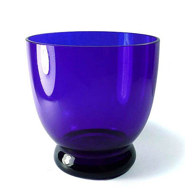 In die Form geblasener, kelchartiger, gefußter Korpus aus leuchtend blauem Glas. Höhe ca. 12 cm, Durchmesser ca. 12 cm, geringe Gebrauchsspuren. Ungemarkt, Form und Farbe sprechen für Holmegaard, wohl 1920er Jahre.