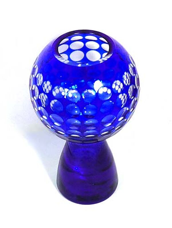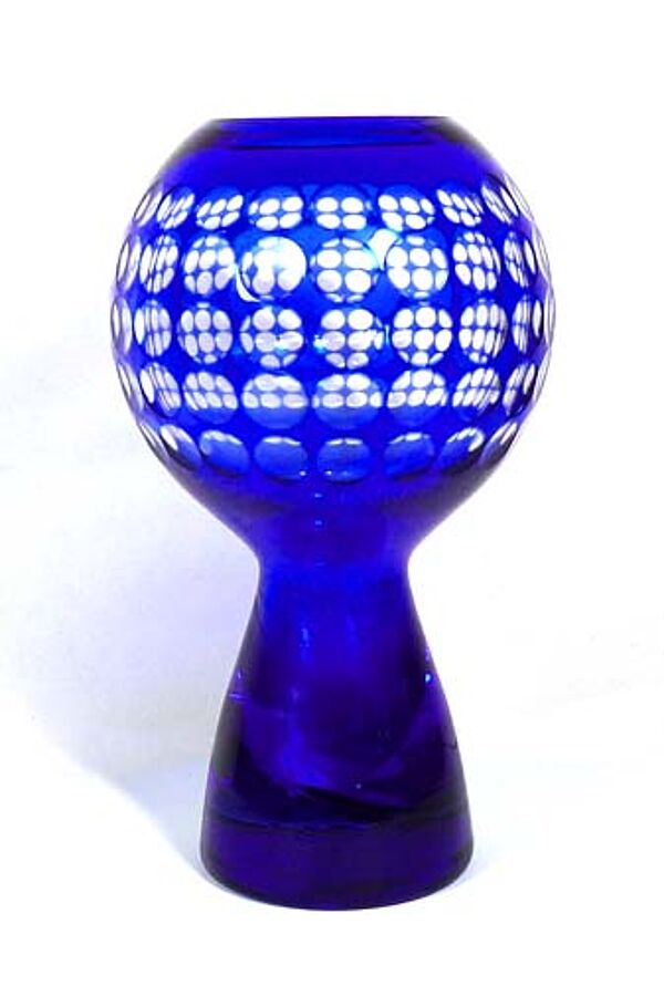 Grosse Ausführung des Klassikers: mittig taillierter, im oberen Drittel betonter, hier fast kugelförmiger Korpus aus leuchtend blau überfangenem, wohl mundgeblasenen Glas. Im oberen Drittel linsenförmige Einschliffe. Höhe ca. 22,5 cm, minimale Gebrauchsspuren. Entwurf wohl von 1977.