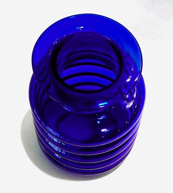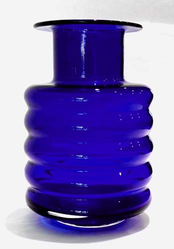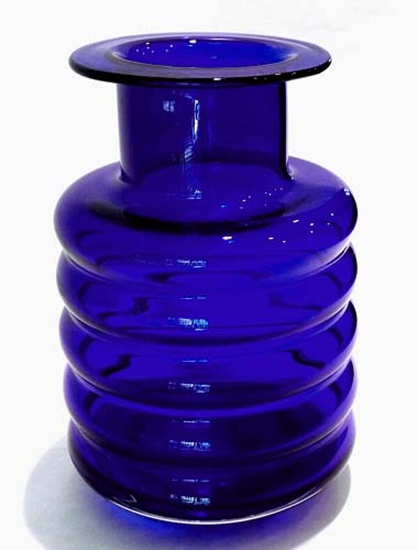 In der Grundform zylindrischer, außenseitig gerippter Korpus mit relativ schmalem Hals und weit ausgestelltem Mündungsrand aus blauem mundgeblasenen Innenfangglas. Höhe ca. 15 cm, minimale Gebrauchsspuren. Vase aus der Serie Wartburg-Souvenir, Entwurf von 1977.