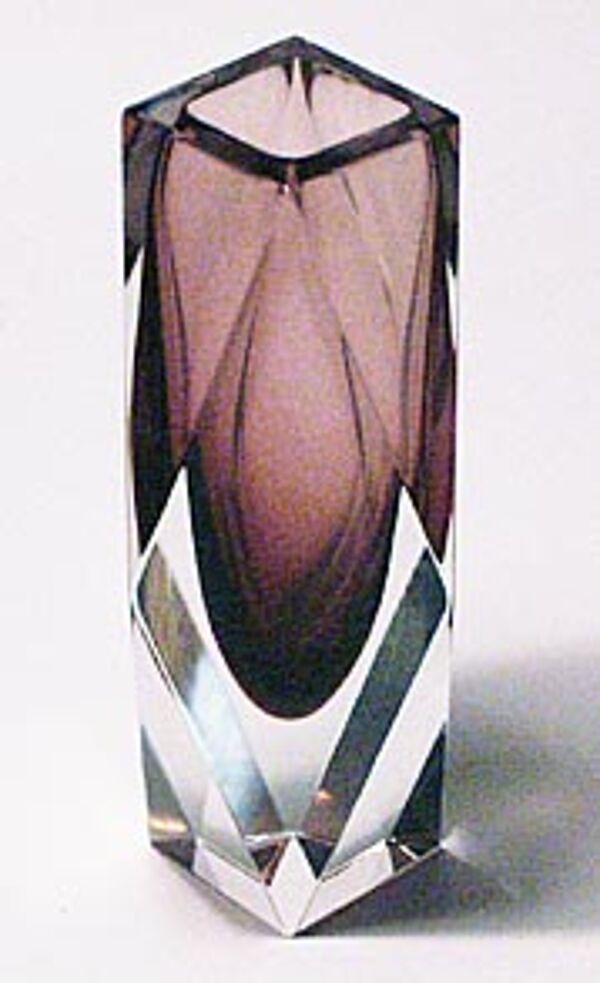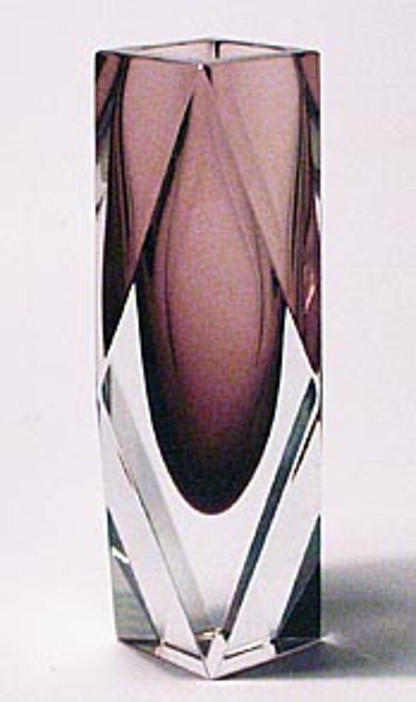 Facettiert geschliffener Korpus aus klarem Glas mit violettem Innenfang, plangeschliffener und polierter Boden bzw. Mündungsrand. Höhe ca. 16,5 cm, geringe Gebrauchsspuren. Wohl 1960er Jahre.