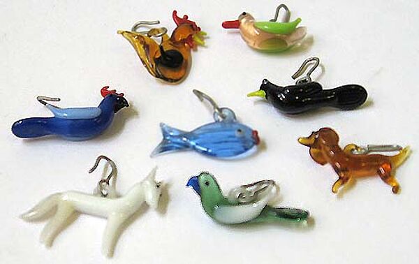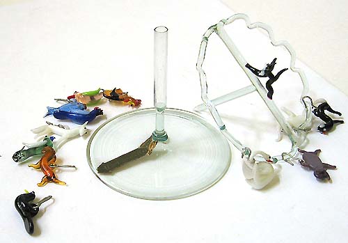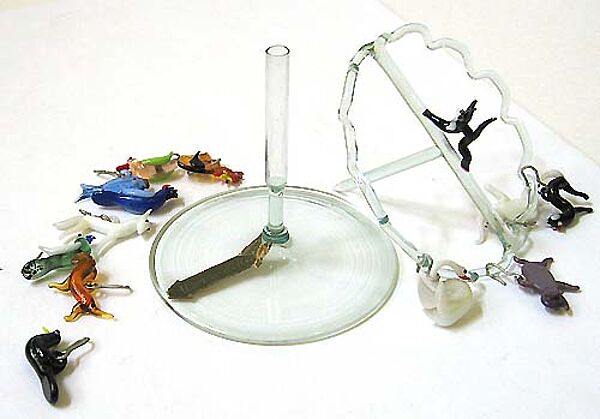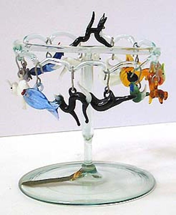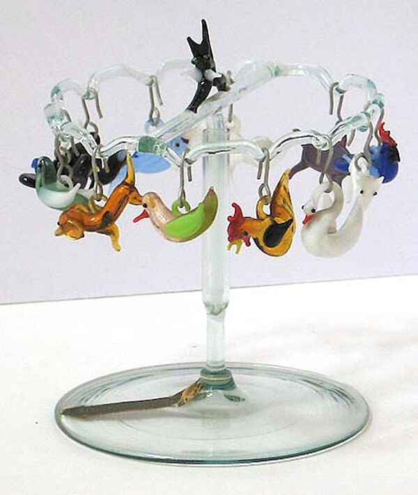 Karussellartiger, drehbarer, gefußter Glaskorpus mit 12 eingehängten, mundgeblasenen Glastierchen. Original-Aufkleber in Pfeilform mit der Aufschrift "Wer gewinnt". Höhe ca. 9 cm, minimale Gebrauchsspuren. Wohl 30er bis 50er Jahre.