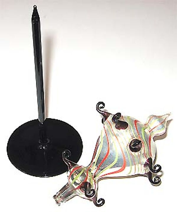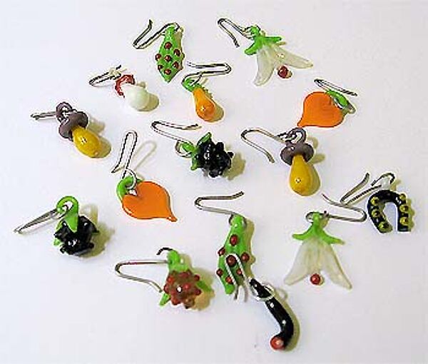 Karussellartiges, drehbares, gefußtes Glasgestell mit zwiebelartigem Glaskorpus, hieran sind 15 mundgeblasene Glasfiguren (wie Früchte, Herzchen und Hufeisen) eingehängt. Höhe ca. 14 cm, minimale Gebrauchsspuren. Wohl 30er bis 50er Jahre.