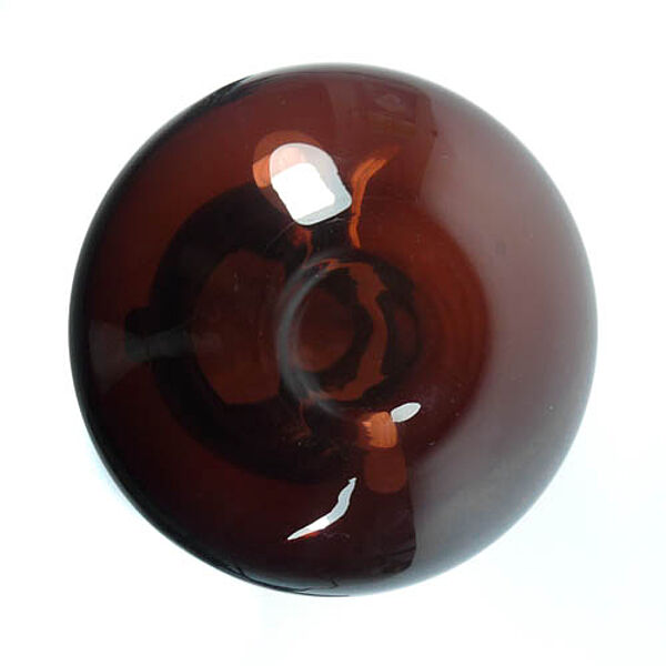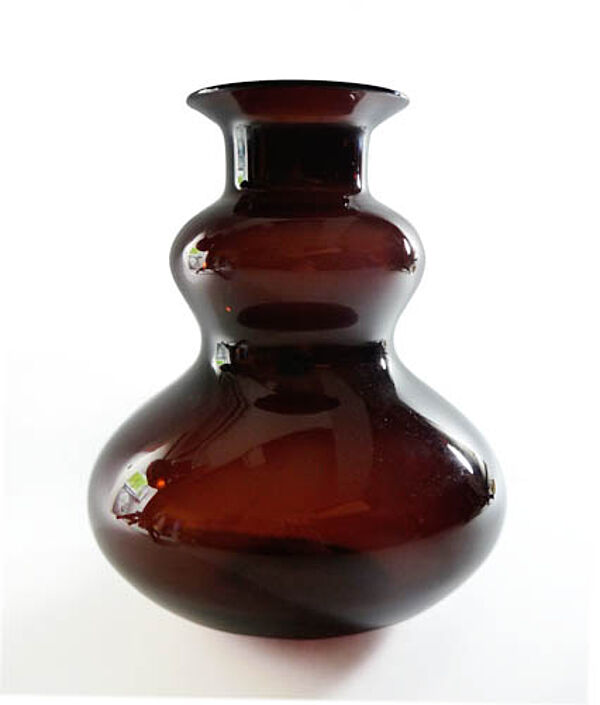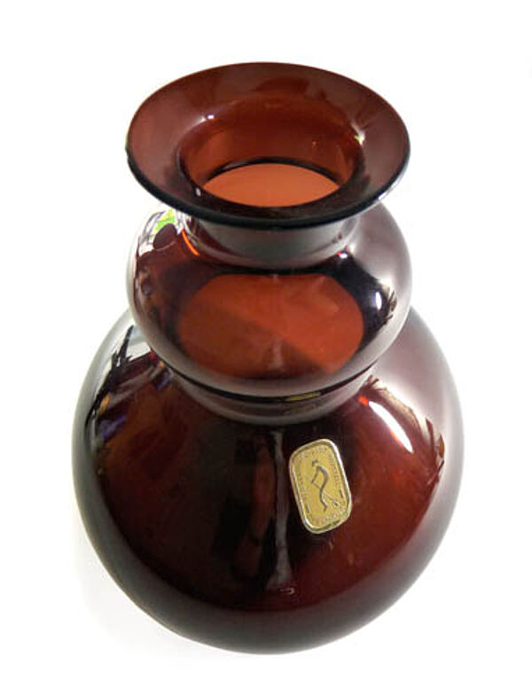 Zweifach taillierter, in die Form geblasener Korpus aus bräunlich-violettem Glas mit ausgestelltem Mündungsrand. Höhe ca. 18 cm, geringe Gebrauchsspuren. An der Wandung Original-Firmenaufkleber: "VEB Glaswerk Harzkristall Derenburg". Mitte / Ende der 1970er Jahre.