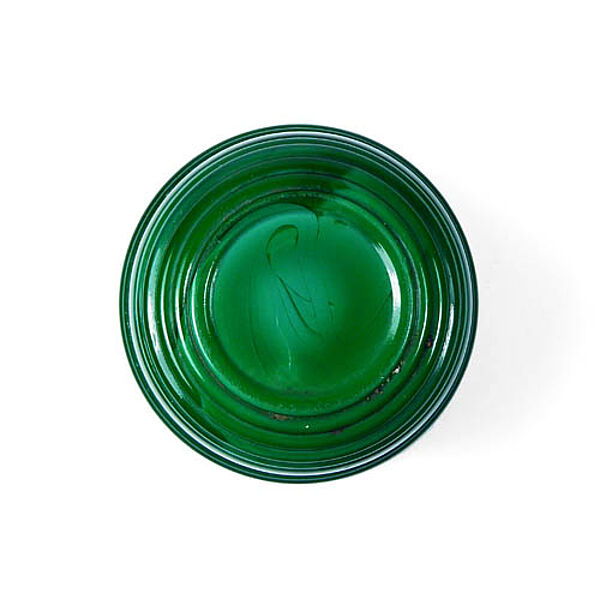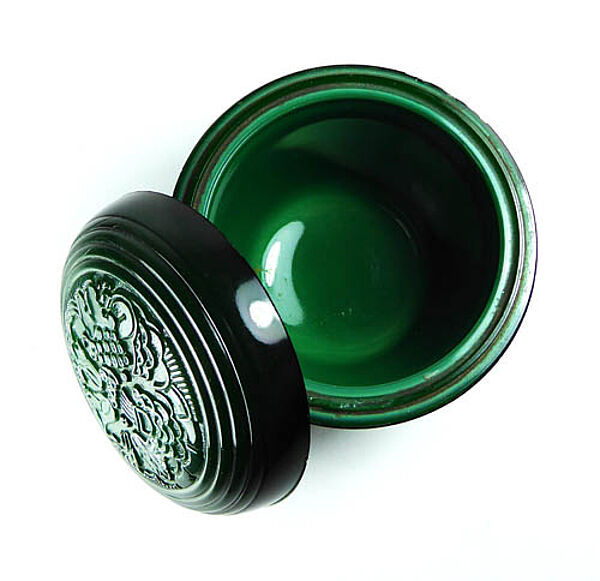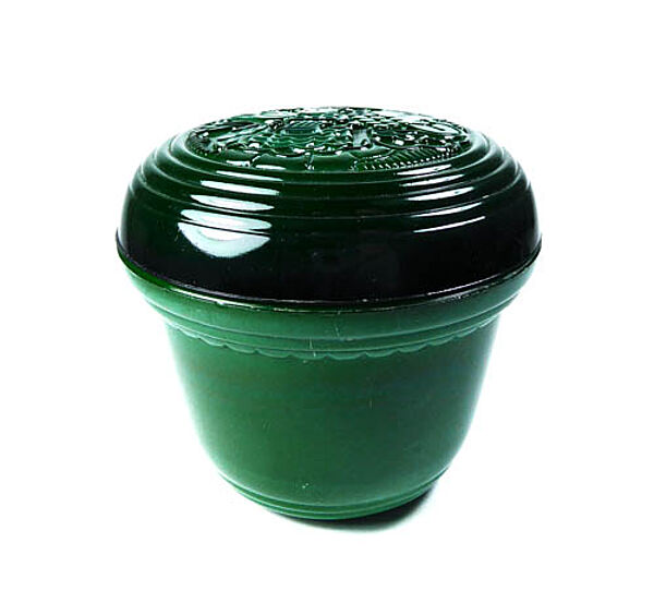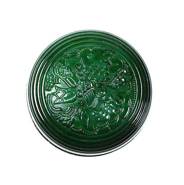 Kapselartiger aus grünem Glas, wobei der Deckel einen dunkleren Farbton aufweist. Dieser weist zudem oberseitig ein florales Relief auf. Höhe ca. 8,5 cm, Deckeldurchmesser ca. 9,2 cm, geringe bis moderate Gebrauchsspuren, insbesondere zeigen sich einige Flohbisse am Rand. Wohl Böhmen der 1920er Jahre.